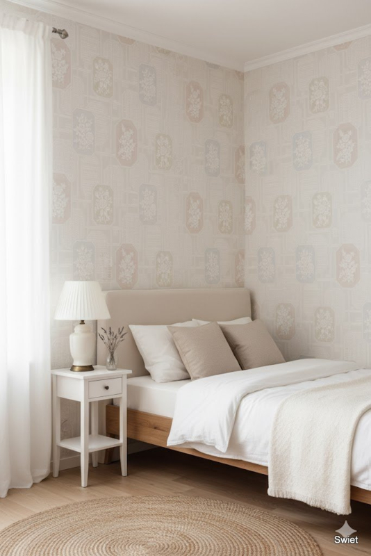 De lichte kleuren maken het behang ideaal voor ruimtes waar je warmte en verfijning wilt samenbrengen.
