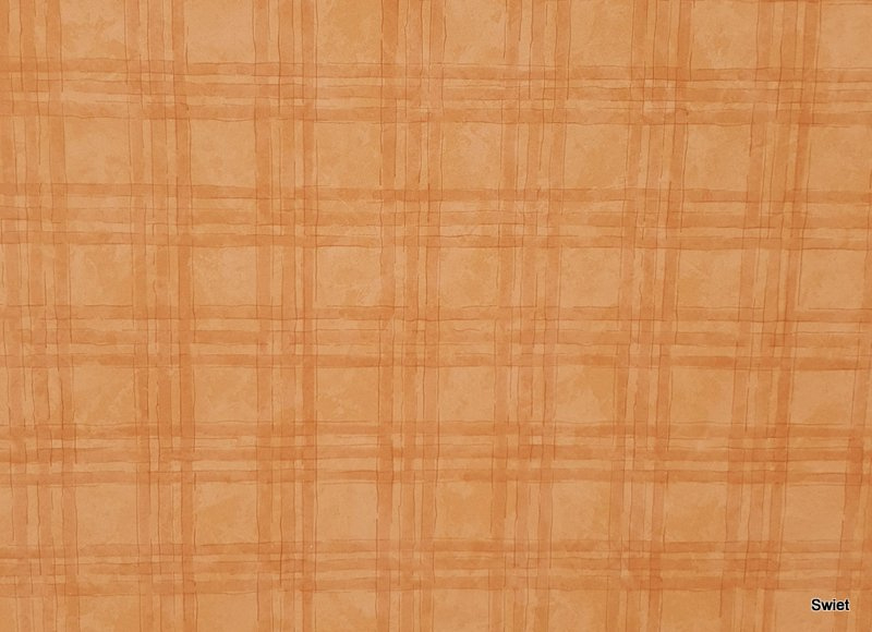 Behang met een ruitpatroon van fijne, losse lijnen over een warme tint tussen oranje en oker in. De lijnen kruisen elkaar in een vrij open vakverdeling, waardoor het dessin duidelijk aanwezig is zonder massief te worden.