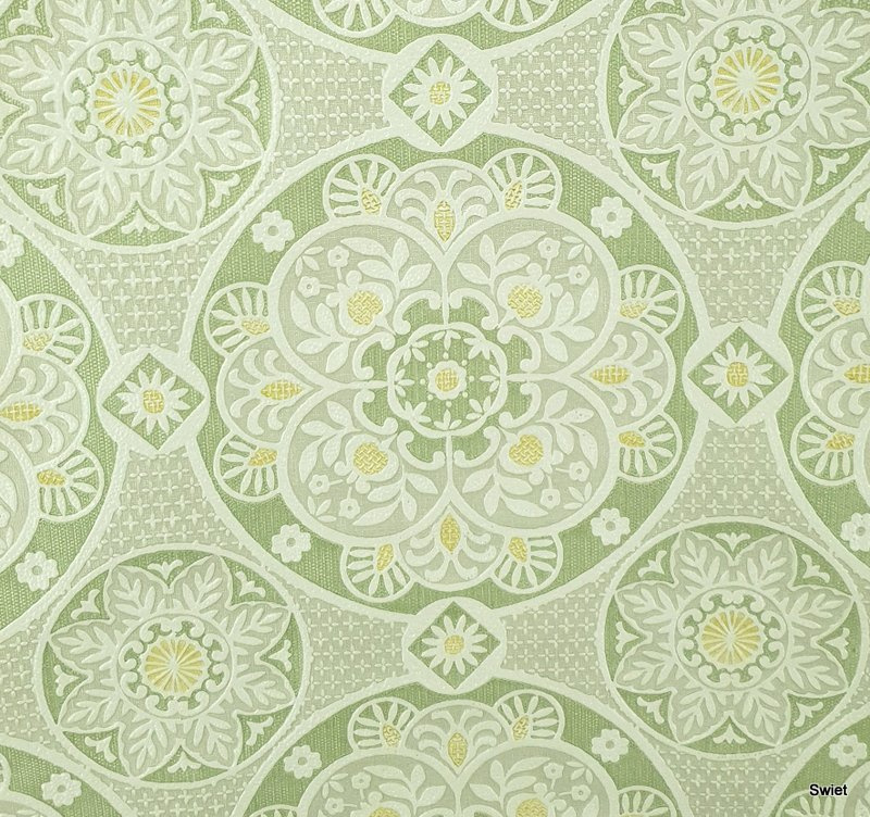 A classic medallion wallpaper with soft colours and textured detail.