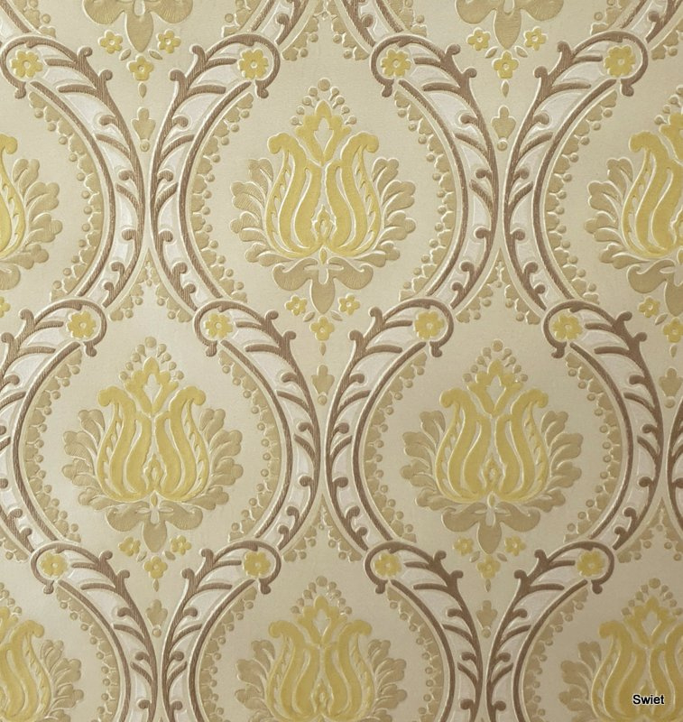 Een klassiek patroon met sierlijke bogen en gestileerde bloemvormen loopt gelijkmatig over de hele rol. Je ziet limegroen, beige en crème, met een glanslaag die het dessin in het echt meer diepte geeft.