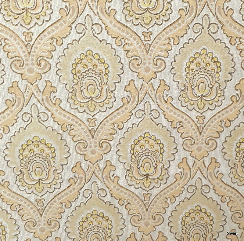 A classic baroque wallpaper with medallion motifs and textured detail.