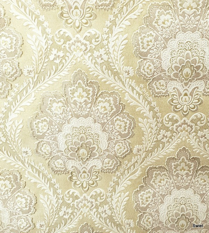 A classic baroque wallpaper with layered motifs and textured detail.