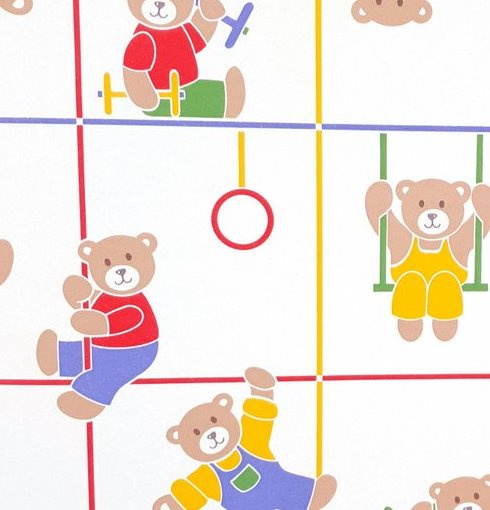 Berenfiguren staan verdeeld over een patroon van vierkante vakken met lijnen in rood, blauw, geel en groen. In de vakken zie je de beren op een schommel, bij ringen en met kleine gewichten. De achtergrond is wit en één vierkant is 13 cm hoog. Storeys behang.