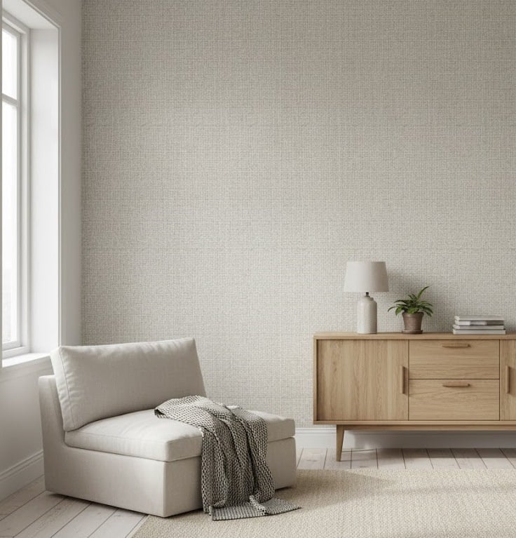 Een subtiel rasterpatroon in lichtgrijs op een beige ondergrond. De structuur oogt zacht en geeft het gevoel van geweven stof, rustig en ingetogen.
