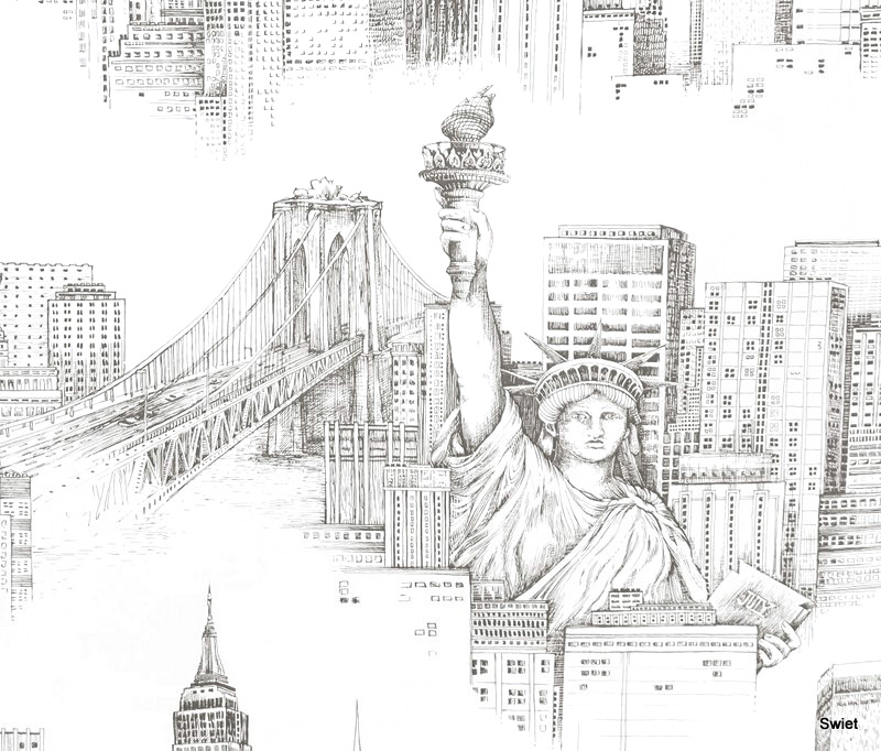 A vintage wallpaper with black line drawings of the New York skyline on a white background, including the Twin Towers.