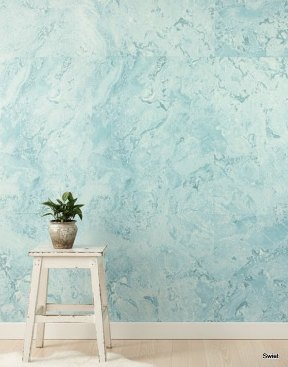 Lichtblauwe marmerlook behang met zachte wolken en nerven. Fris en clean zonder koel te worden. Lekker voor een lichte ruimte, met een heel dun streepje om de tegel te laten zien.