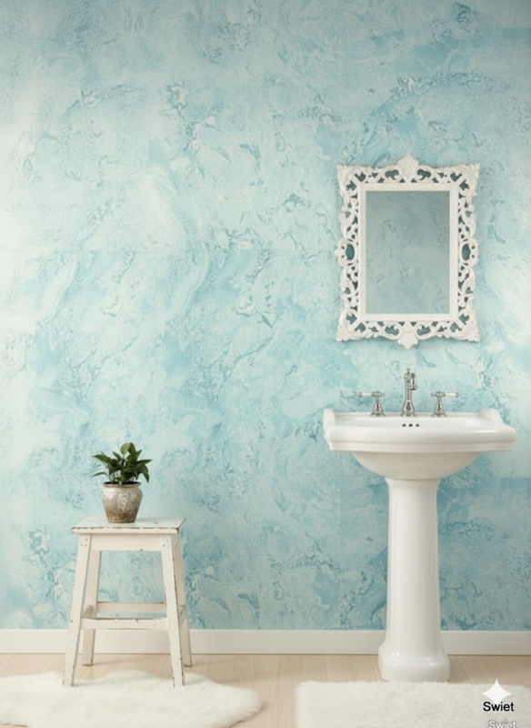 A soft light blue marble look vintage wallpaper. Fresh, airy and easy to style.