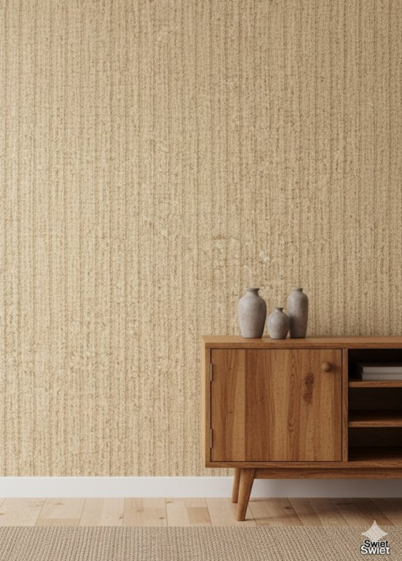 Beige basis met rustige verticale lijnen en kleine stipjes. Een fijne textielachtige jutelook indruk in de print, zonder druk te worden. Mooi als je warmte wilt zonder poespas. Werkt lekker met linnen en aardetinten.