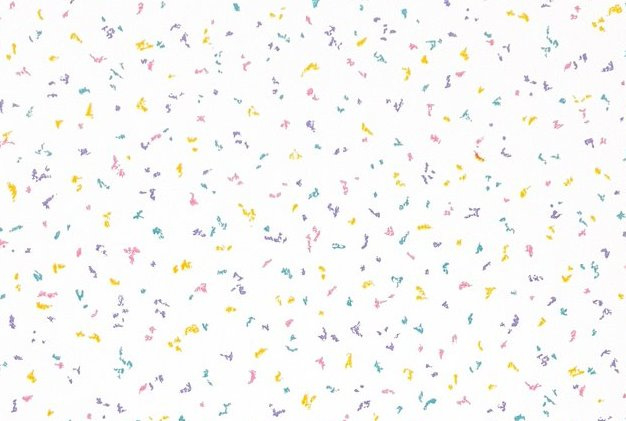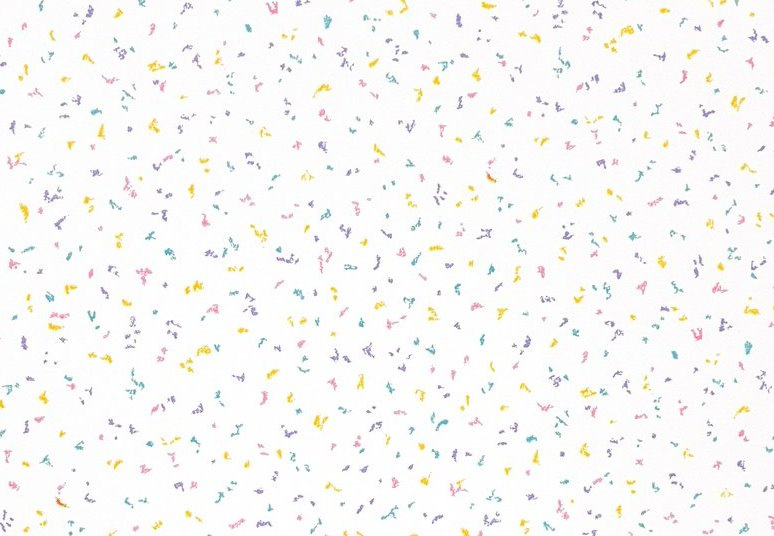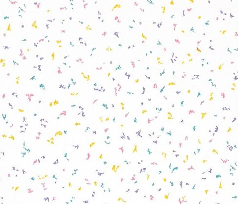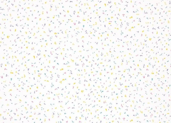 Wit behang met heel kleine spikkeltjes en streepjes in geel, roze, paars en turquoise. De gekleurde tekentjes liggen luchtig verspreid over de lichte achtergrond, waardoor het dessin een speels en typisch jaren 80 beeld krijgt.