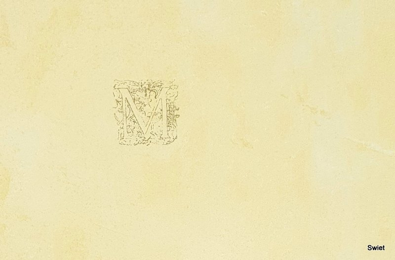 Op de botergele achtergrond staan kleine gouden letters los verspreid over het papier. De ondergrond is licht gemêleerd, waardoor het geheel niet vlak oogt. Het behang is van Esta.