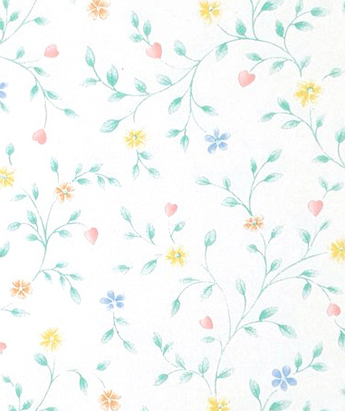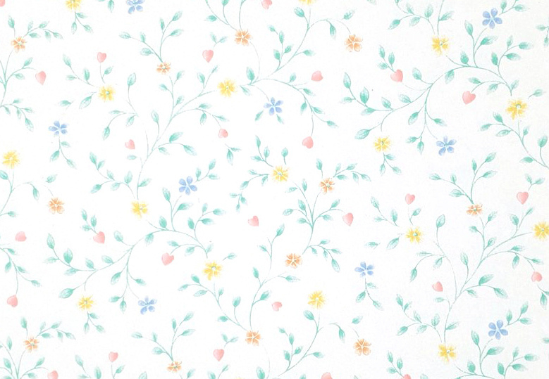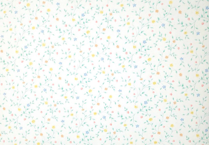 A vintage Storeys wallpaper with tiny flowers, buds and green twigs on a white background.