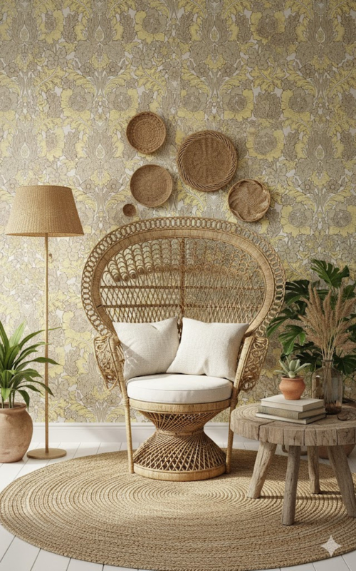 Floral ornament vintage wallpaper in soft yellow and greys. 6767