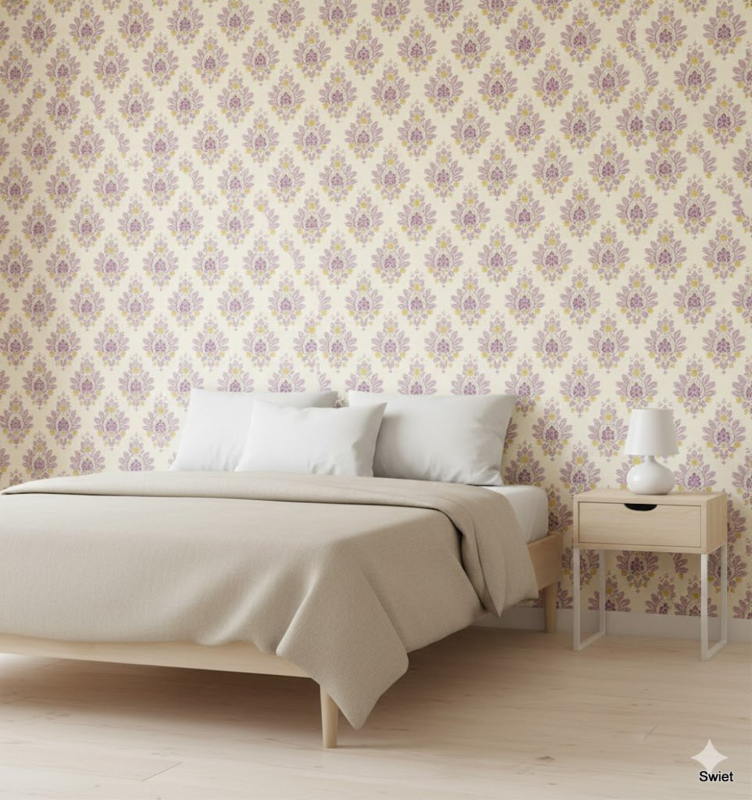 Kleine herhaalde motiefjes in paars en geel op lichte achtergrond met een glimmertje erin. De schaal is bescheiden en de herhaling strak, daardoor blijft het patroon netjes en fris. De kleurcombinatie geeft een vriendelijk accent.