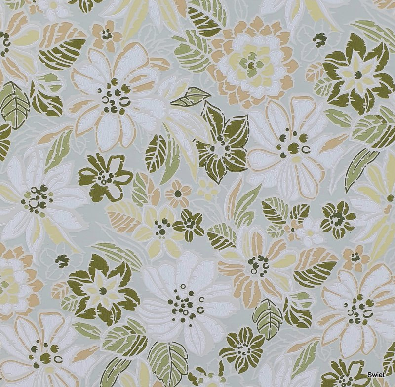 Dit oude behang heeft een volle print die toch helder blijft door de lichte ondergrond. Juist die combinatie van veel bloemen en zachte kleuren maakt het een mooie vondst voor wie zoekt naar vintage behang met een doorlopend bloemendessin.