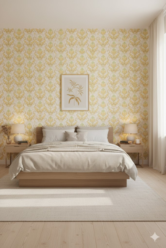 Soft yellow and green vintage baroque wallpaper with gentle classic charm.
