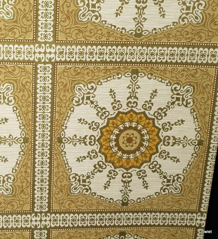 A vintage medallion wallpaper with a tiled pattern in warm tones.