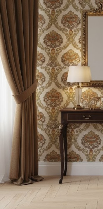 Een rijk vintage behang met een opvallend barok dessin in bruin, terra, goud en oker. De ornamenten zijn symmetrisch opgebouwd en geven een gevoel van grandeur zonder te schreeuwen. De warme kleuren en zachte glans roepen direct het gevoel op van de jaren 70, toen dit soort dessins het hart van menig woonkamer vormden.