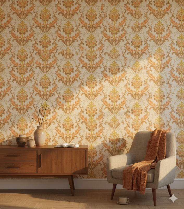 A warm vintage baroque wallpaper in soft orange and gold tones with a calm 70s elegance.