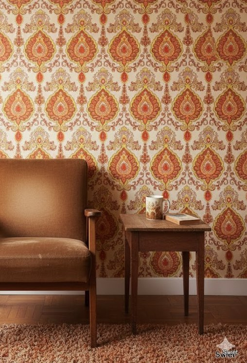 A beautiful authentic vintage wallpaper with warm tones and elegant baroque inspired flowers. A soft bold look that brings character and warmth into any space.