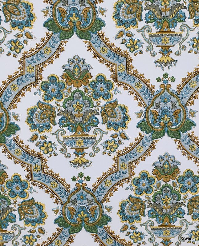 In dit oude behang zit veel detail, juist door de combinatie van kleurvlakken en fijne lijnen. Rollen uit oude voorraad als deze hebben iets eigens, omdat je in het dessin steeds weer andere kleine vormen en accenten ziet.