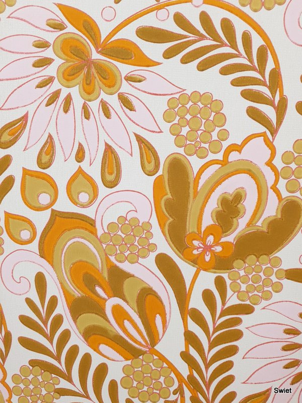 A vintage organic wallpaper in ochre and orange tones.