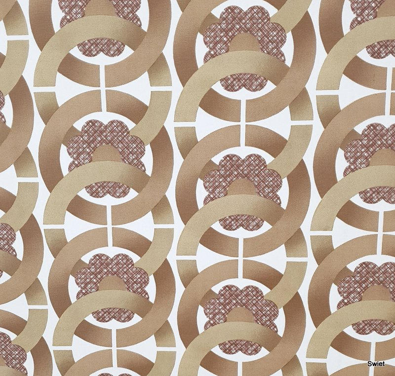 Het is vinyl vintage behang, en juist dat past goed bij dit uitgesproken jaren 70 patroon. Rollen uit oude voorraad als deze hebben iets eigens, zeker wanneer kleur, vorm en herhaling zo helder samenkomen in één dessin.