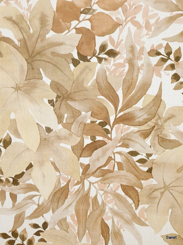 Een wit vlak met geschilderde bladeren en takken in beige, zand, lichtbruin en zacht taupe. De vormen lopen los over elkaar heen, met transparante kleurvlakken en fijne lijnen die het dessin een zachte opbouw geven.