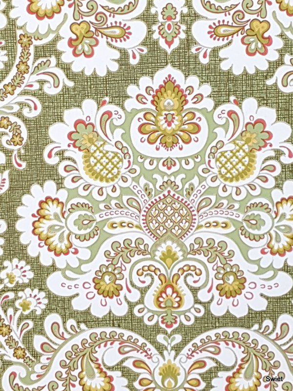 Een wit barok patroon loopt in brede banen over een groenbruine ondergrond. In het dessin zitten roze, geelgroene en okerkleurige details, met veel krullen, bloemen en kleine ingevulde vormen.