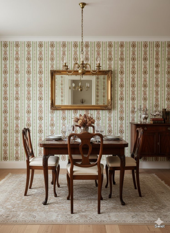 Elegant vintage behang met verticale banen in zachte tinten groen en perzik. Binnen de banen zijn sierlijke barokmotieven verwerkt die diepte en ritme geven aan het patroon. De herhaling oogt klassiek en warm, maar blijft luchtig door de lichte achtergrond.