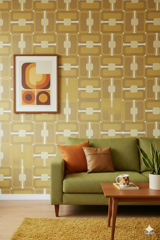 Bold seventies geometric wallpaper in warm ochre and brown.