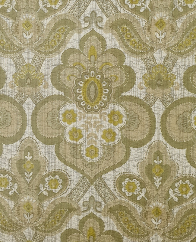 Een gebroken witte ondergrond is gevuld met een herhalend patroon in groentinten, beige en zacht geel. Je ziet bloemvormen, gebogen lijnen en paisleyachtige vormen die in elkaar grijpen en het papier een vaste herhaling geven.