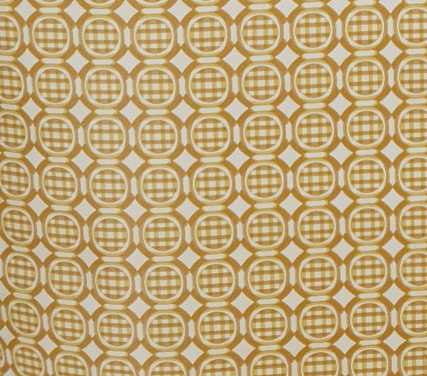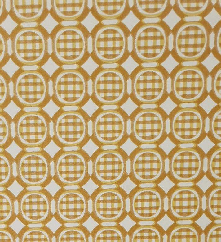 Rijen met ronde vormen lopen in een vaste herhaling over het papier. In elke cirkel zit een ruitjespatroon, met daaromheen banen in bruin, mosterdgroen en gebroken wit.