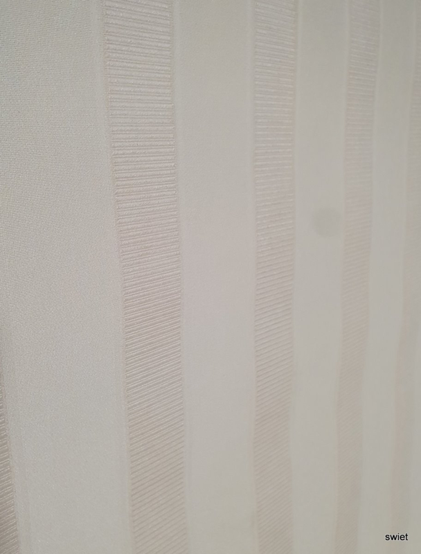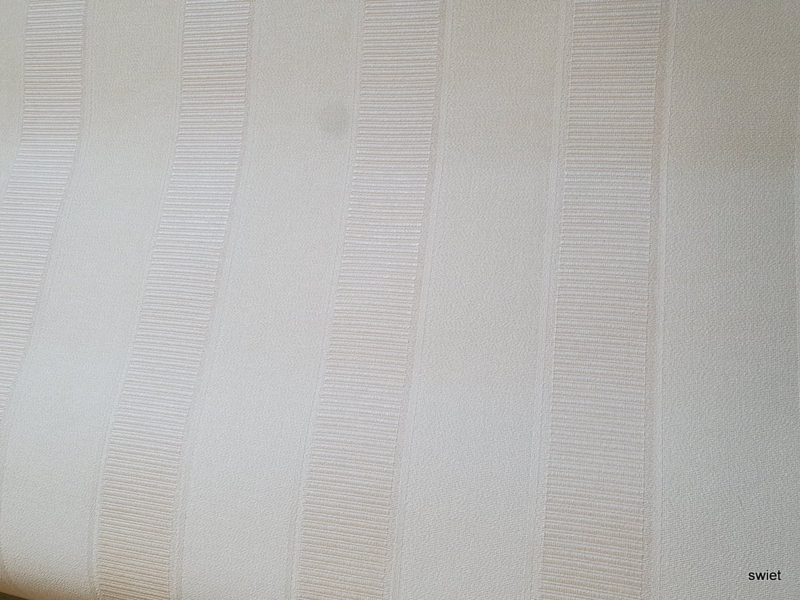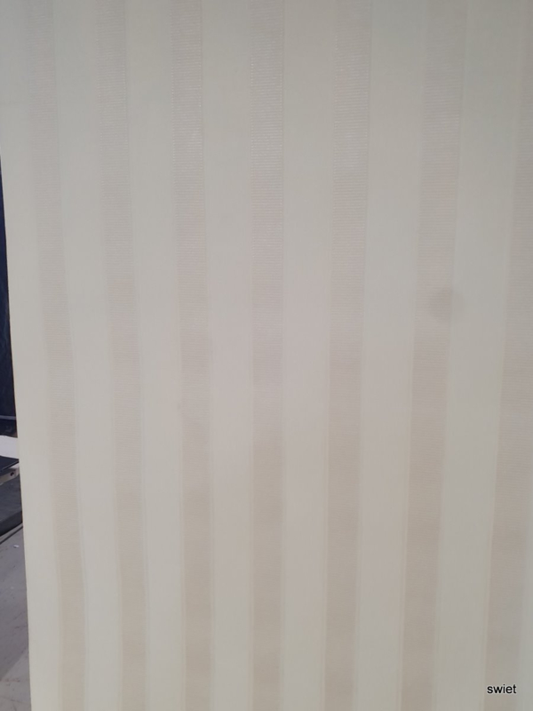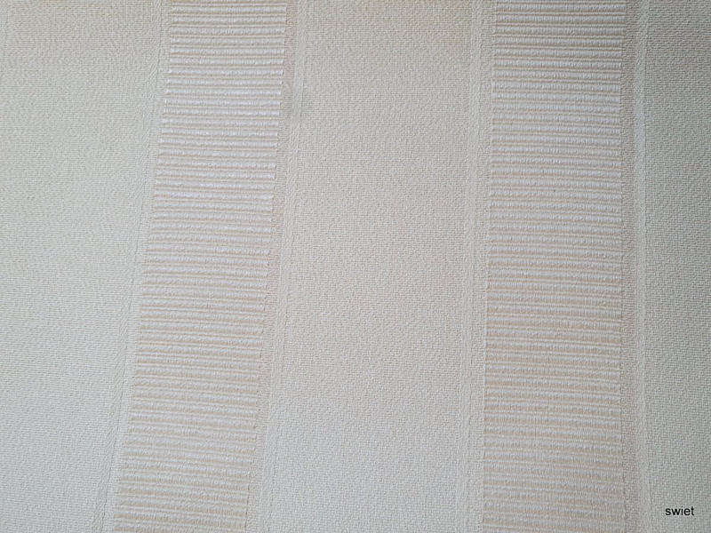 Brede verticale strepen wisselen elkaar af in crème tinten. De banen hebben een licht verschil in tekening, waardoor een rustig streeppatroon ontstaat dat net wat meer diepte krijgt. Dit is vinyl behang en de lichte glans is op de foto maar deels te zien.