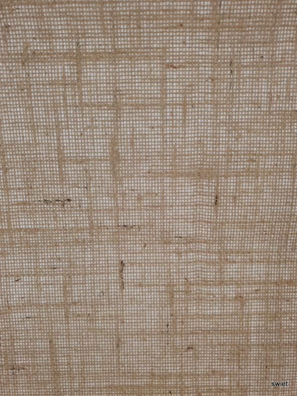 Een beige ondergrond is gevuld met een open geweven patroon van zichtbare draadjes. Daarover ligt een blokachtig lijnenspel in iets lichtere en donkerdere tinten, waardoor het vlak een onregelmatige opbouw krijgt. Het is echt vintage jutebehang met een stevige zware kwaliteit.