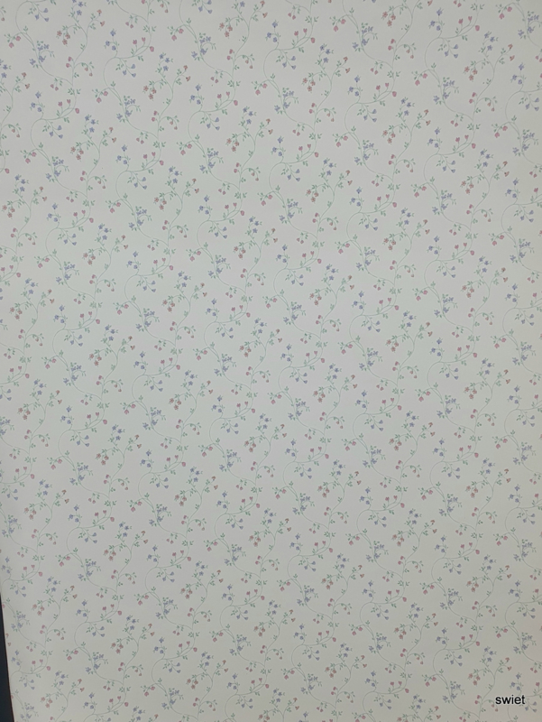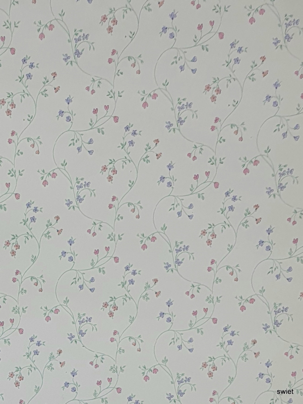 De kleuren zijn licht en rustig gehouden. Door de dunne takjes en kleine bloemetjes oogt het geheel verfijnd en vriendelijk. Dit is een klassiek bloemendessin zoals je dat vaak ziet bij vintage behang, subtiel en makkelijk te combineren.