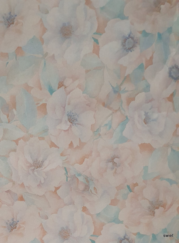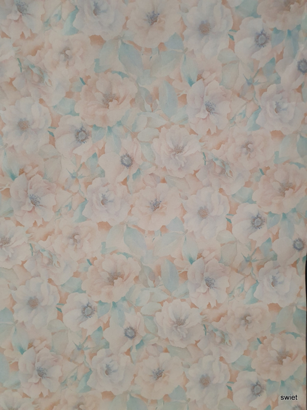 Zoete zachte bloemen vloeien in elkaar over alsof ze met aquarel zijn geschilderd. Je ziet zalm en poederroze met lichtblauw en turquoise, en in de bloemharten zit een grijzig blauw dat het geheel net wat diepte geeft. Doordat er geen harde lijnen zijn, blijft de wand rustig en dromerig.