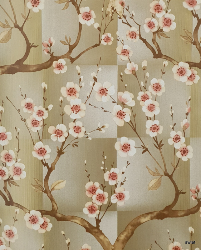 Japanse bloesemtakken lopen hier sierlijk over een achtergrond van zachte banen en vlakken in beige, crème en licht goud. Aan de takken zitten kleine bloesems in wit en roze, met fijne bruine lijnen en bladeren in beige tinten.