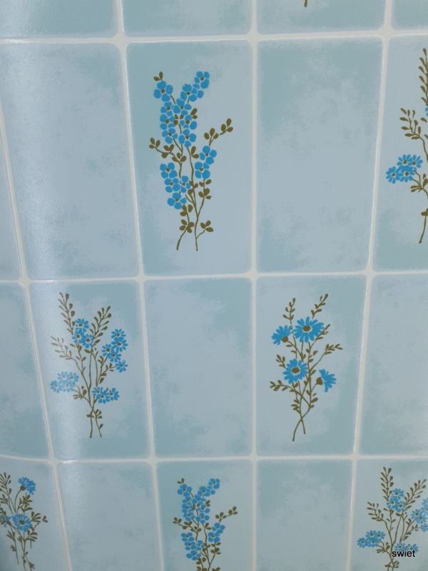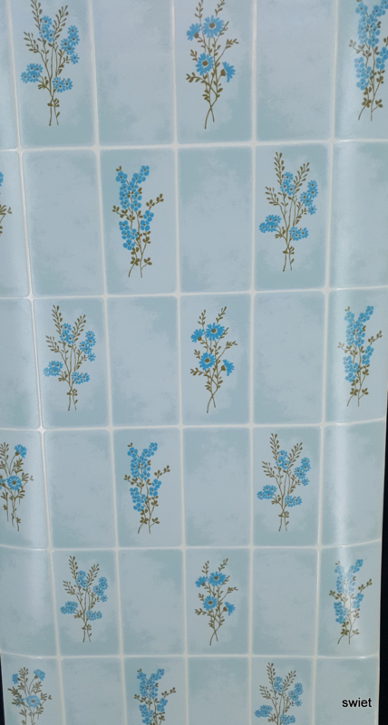 Dit behang heeft een zachte lichtblauwe tegellook met kleine boeketjes in helder blauw en mosgroene takjes. De kleuren zijn fris maar toch warm genoeg om een nostalgische sfeer te geven. Het is een duplex vinyl uitvoering, dus echt een dikke zware kwaliteit die je vooral veel zag in keukens en badkamers uit de seventies. Perfect wanneer je muren hebt die iets kunnen verbergen of wanneer je een vochtige ruimte op een mooie manier wilt aanpakken.