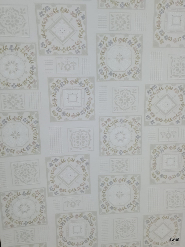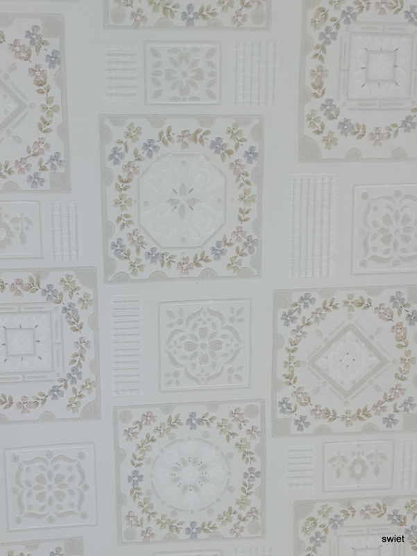 Soft vintage wallpaper with white grey tile patterns and delicate floral wreaths for a calm retro room.
