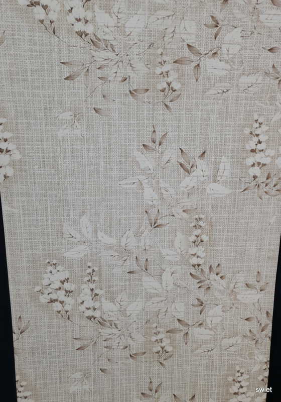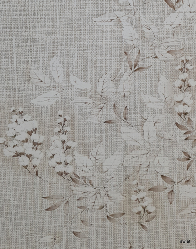 Dit behang heeft een warme beige jutelook achtergrond met subtiele bloem- en bladmotieven in zachte bruintinten. Het voelt heel rustig en natuurlijk aan, precies die fijne vintage sfeer die zo mooi werkt in lichte en warme interieurs. De combinatie van het geweven effect en de zachte bloemen maakt het vriendelijk zonder dat het druk wordt.