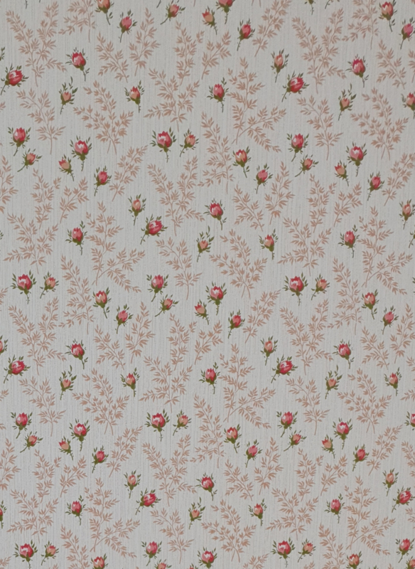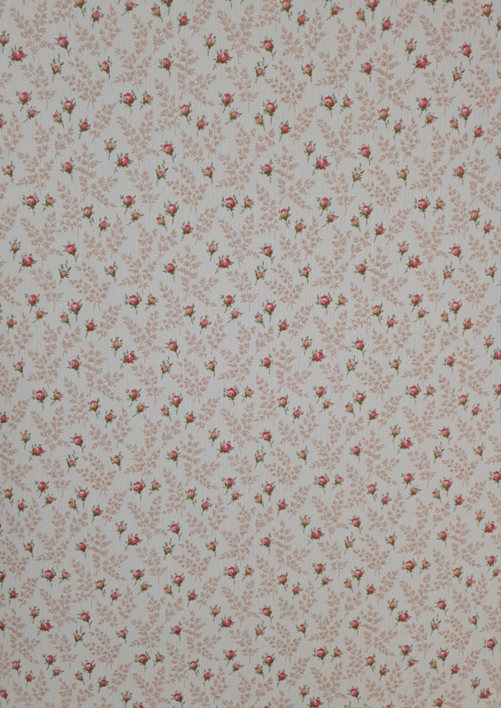 Er zit iets heel verfijnds in dit dessin. Juist door die kleine herhaling blijft het rustig om naar te kijken, terwijl de roze knopjes het patroon net wat zachter maken. Een mooi oud behang voor wie houdt van bloemen die niet te groot of te aanwezig zijn.