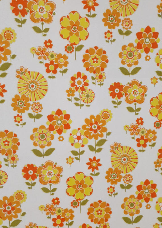 Original 70s wallpaper with bright orange and yellow flowers.