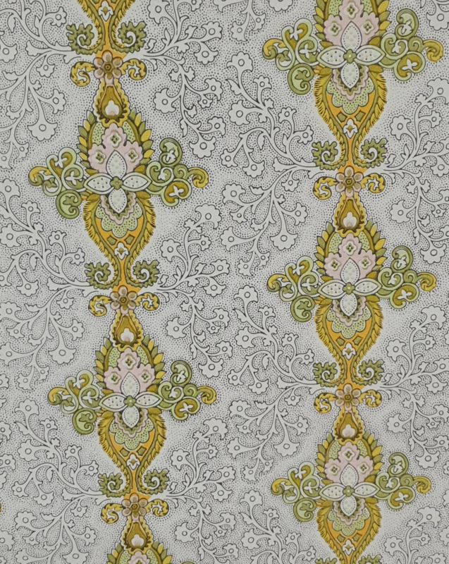 De herhaling is duidelijk, maar er zit veel te zien in de kleine details. Juist die combinatie van fijne zwarte lijnen en de grotere sierlijke vormen maakt dit papieren behang rijk zonder onrustig te worden. Het is oud behang met een uitgesproken dessin dat toch netjes in ritme blijft.