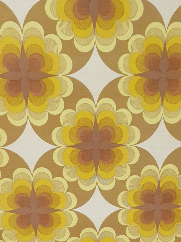 Door die duidelijke herhaling krijgt het patroon iets krachtigs, terwijl de kleuren dicht bij elkaar blijven. Het is papieren behang met een uitgesproken jaren 70 dessin dat toch rustig genoeg blijft om goed naar te blijven kijken.