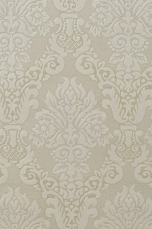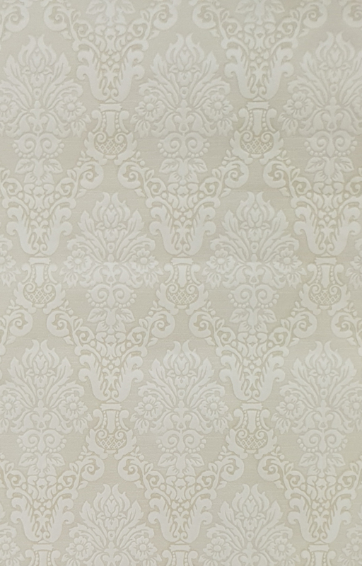 Een licht beige ondergrond is gevuld met een groot barok patroon in wit en zacht crème. In het dessin zie je krullen, bloemvormen en sierlijke opbouw die zich gelijkmatig over het hele behang herhalen. De structuur ligt duidelijk boven op het patroon en maakt de vormen goed zichtbaar.