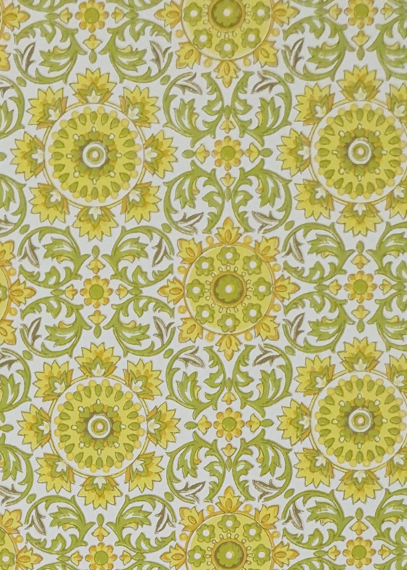 Een dicht patroon van ronde vormen, bloemachtige details en krullende bladeren loopt over de hele lichte achtergrond. Geel, oranje en verschillende groentinten wisselen elkaar af, met fijne lijnen en kleine accenten die het dessin compact en ritmisch maken.