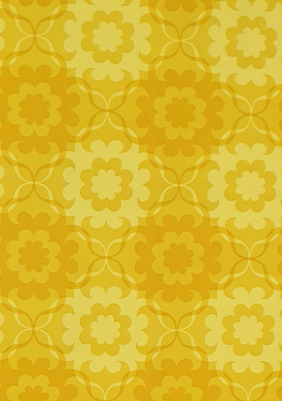 A bright 70s wallpaper with a bold floral repeat.
