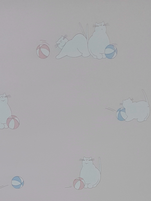 Tegen de babyroze achtergrond staan witte katten met grijze belijning, verspreid over het dessin. Bij de katten liggen en rollen ballen in roze en blauw. De katten zijn in verschillende houdingen getekend, soms alleen en soms met meer bij elkaar.