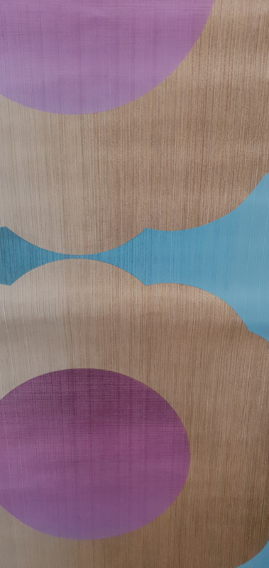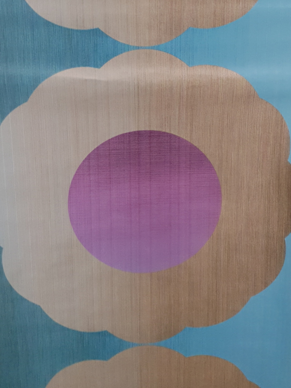 In het dessin staan bloemvormen met een ronde paarse kern en een bloemrand in bruin goud, tegen een blauwe achtergrond. De vormen herhalen zich in banen over de rol. Over het oppervlak ligt een metallic glans, waardoor de kleuren anders oplichten.