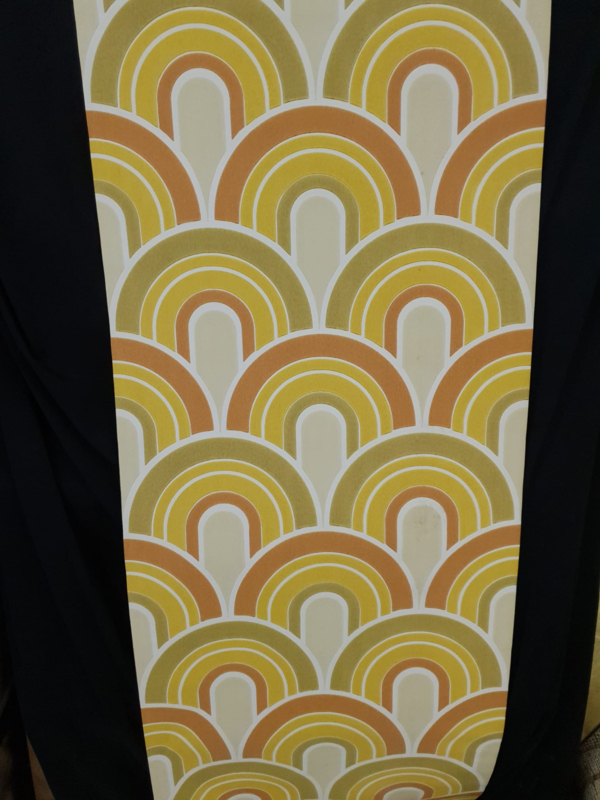 De tekening heeft die duidelijke groovy lijn van de jaren 70, met een dessin dat meteen herkenbaar is. Het is papieren behang uit oude voorraad, met iets van new old stock. Juist daarin zit ook iets duurzaams voor wie graag met originele oude prints werkt.
